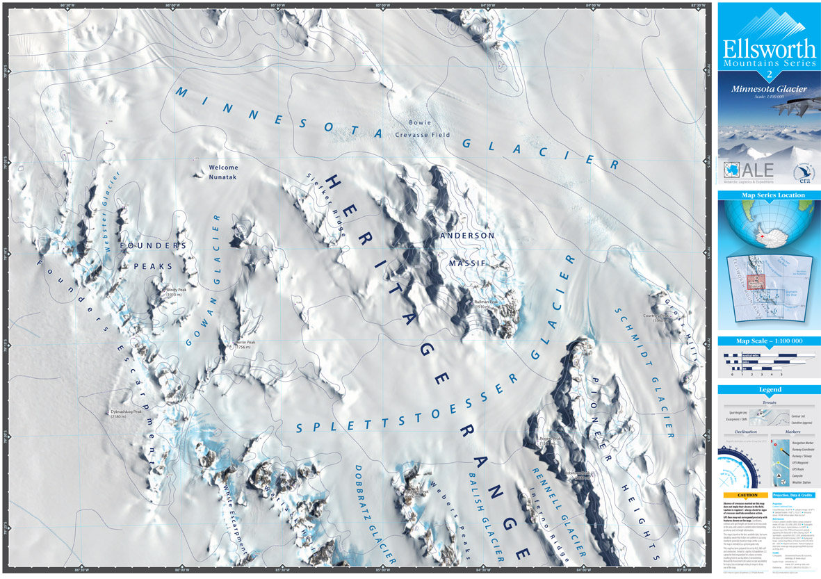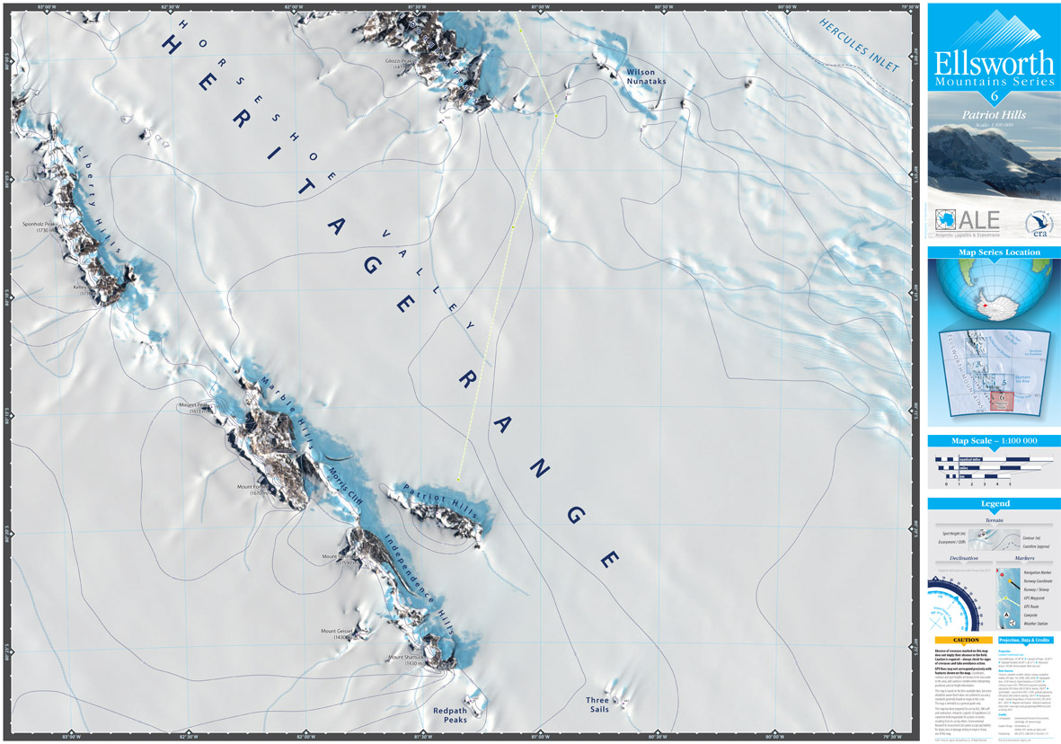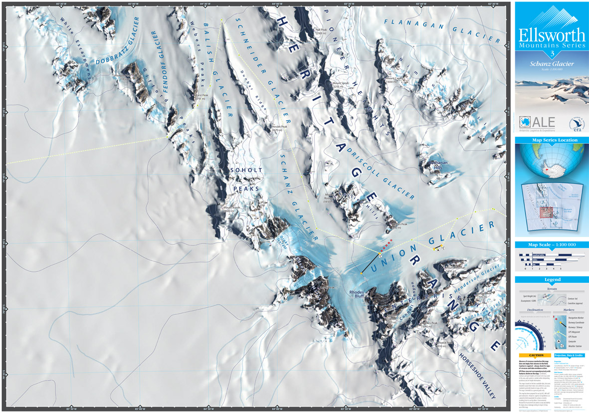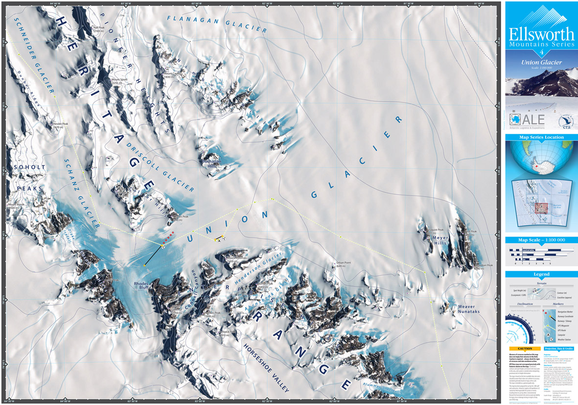 Environmental Research & Assessment produced a map series of The Ellsworth Mountains for Antarctic Logistics & Expeditions in October 2011. There are six 1:100 000 maps in the series:- Sheet 1 Vinson Massif, Sheet 2 Minnesota Glacier, Sheet 3 Schanz Glacier, Sheet 4 Union Glacier, Sheet 5 Meyer Hills and Sheet 6 Patriot Hills. In addition, a more detailed 1:35 000 map has been made of Union Glacier. Click on the map panels at the foot of this page to view the maps.