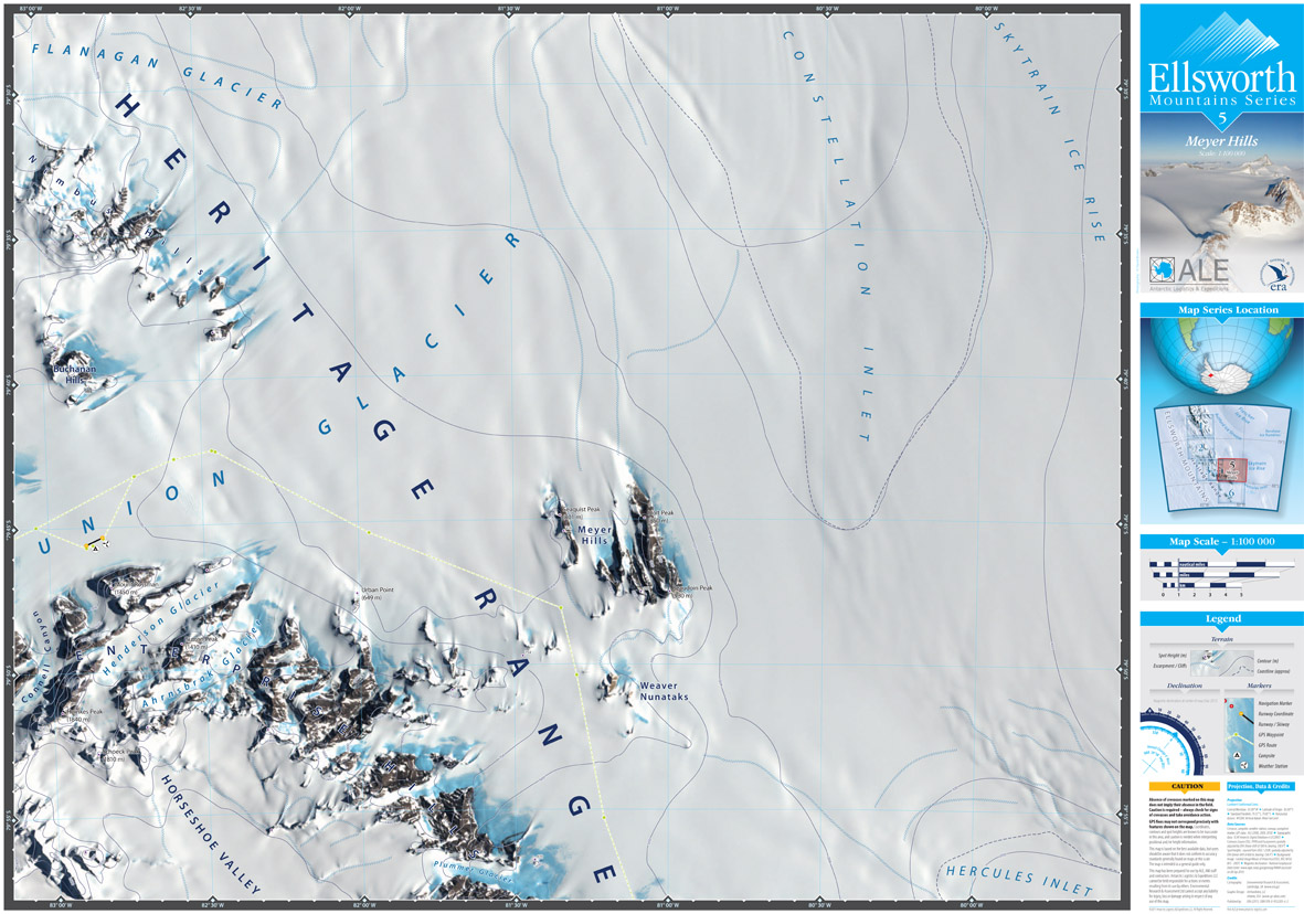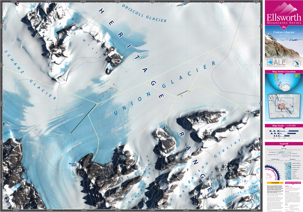 In 2016, ERA produced an overview map for the Ellsworth Mountains Series covering the area from the Ellsworth Mountains to South Pole at a scale of 1:1 500 000. The map's projection was customised to use a central meridian of 80°W, as this corresponds roughly to the longitude of travel by skiers to the Pole when they start from Hercules Inlet.